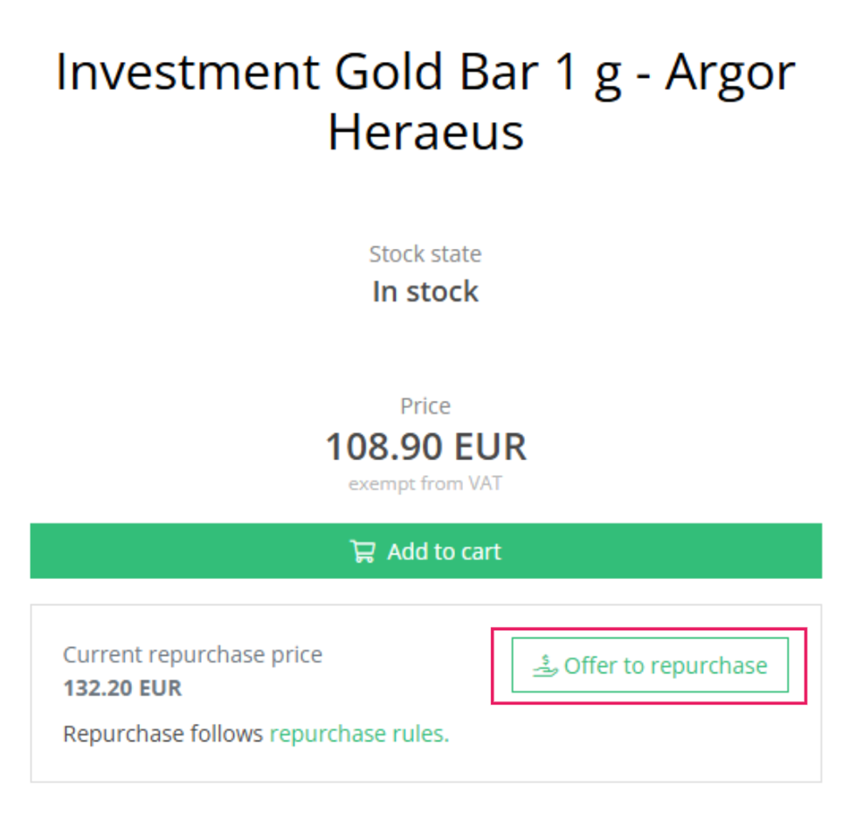 As market prices of precious metals fluctuate continuously, we can guarantee the repurchase price for such an offer for 24 hours only. After this period, the offer will be updated based on the current spot price of the precious metal.