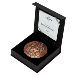 Měděná medaile Český lev s pamětním listem, inkusní ražba, patina stand