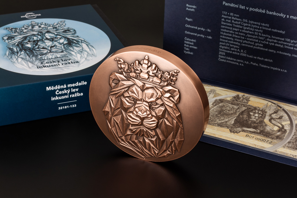 Český lev České mincovny, který v průběhu let dostal mnoho podob, je od samého počátku dílem Asamata Baltaeva, DiS. Ten se však v roce 2025 tohoto úkolu zhostil naposledy a na rozloučenou vytvořil výjimečnou sadu složenou z pamětní medaile a pamětního listu.