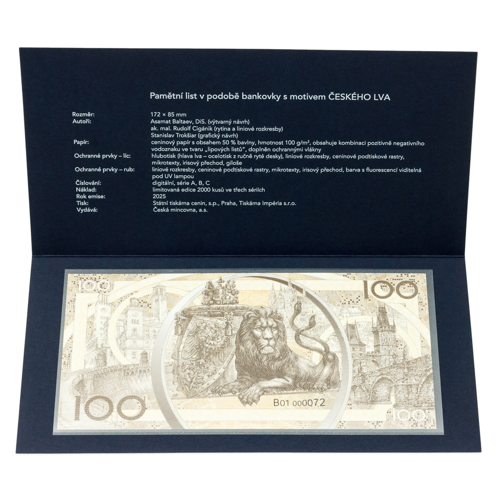 Pamětní listy v podobě bankovek, které jsou známé též jako paměťovky, se v posledních letech těší velké oblibě mezi sběrateli. V podstatě se jedná o papírovou obdobu pamětních medailí, které nedisponují nominální hodnotou, a tudíž nejsou legálními platidly, avšak na první pohled jsou od nich nerozeznatelné. Paměťovky jsou vytištěny na ceninovém papíře a nechybí jim pokročilé ochranné prvky proti padělání. Jejich témata jsou rozličná – zpravidla připomínají velké osobnosti či významná výročí. První pamětní list v podobě bankovky, který vydává Česká mincovna, vzdává hold dvouocasému českému lvovi. Tato šelma od roku 2017 vévodí oblíbeným investičním mincím a v posledních devíti letech se de facto stala maskotem společnosti.