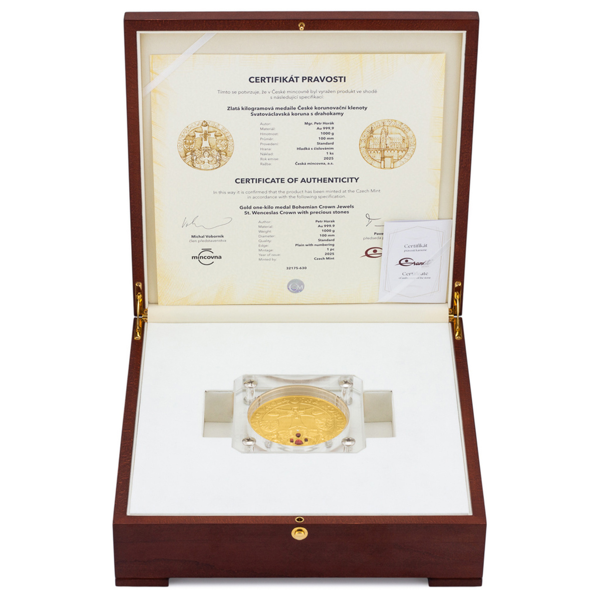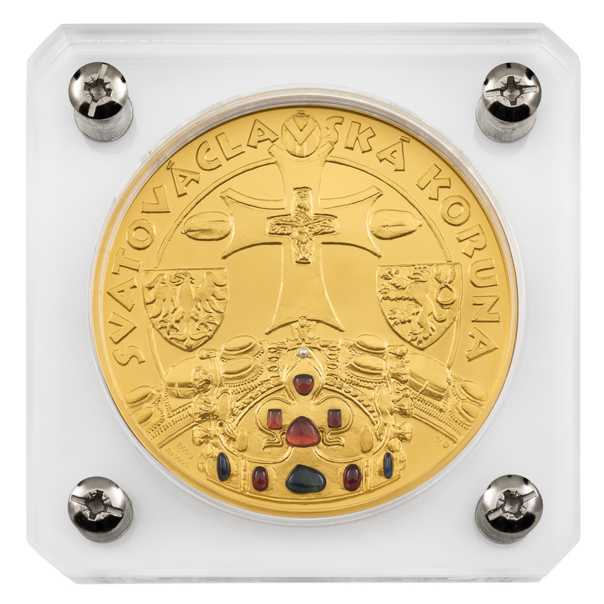 Na averzní straně kilogramové zlaté medaile najdete celkový pohled na Svatováclavskou korunu, který je doplněn heraldickými zvířaty a detailem křížku zdobícího vrchol klenotu.