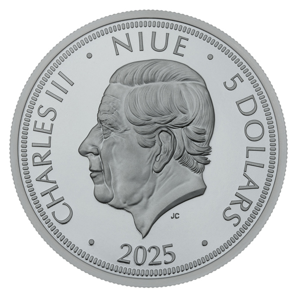 Reverznej strane dominuje ručiaci český lev v realistickom stvárnení, ktorý má na hlave svätováclavskú korunu. Doplnkovým motívom vysokého reliéfu je orlica, ktorá je syntézou svätováclavského, moravského a sliezskeho dravca, a česká vlajka. Autorom reliéfu je už tradične medailér Asamat Baltaev, DiS. Pretože mince Českej mincovne vychádzajú v licencii zahraničného emitenta, ktorým je ostrov Niue, ich averzná strana nesie jeho nevyhnutné atribúty – portrét kráľa Karola III.,  nominálnu hodnotu 5 DOLLARS (NZD) a rok emisie 2025.