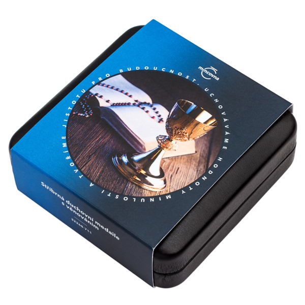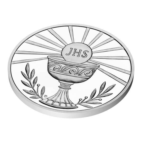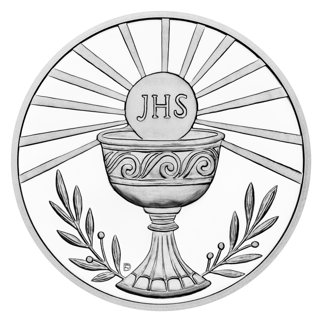 Na averzní straně medaile, která je dílem medailérky Štěpánky Doležalové, najdete hostii a kalich – čili tělo a krev Kristovu. Reverzní strana orámovaná ozdobným dekorem je pak vyhrazena pro vyrytí textu, který může mít podobu osobního vzkazu, jména, letopočtu, citátu, biblického verše, … – fantazii se meze nekladou. Jediným limitem je rozsah textu.