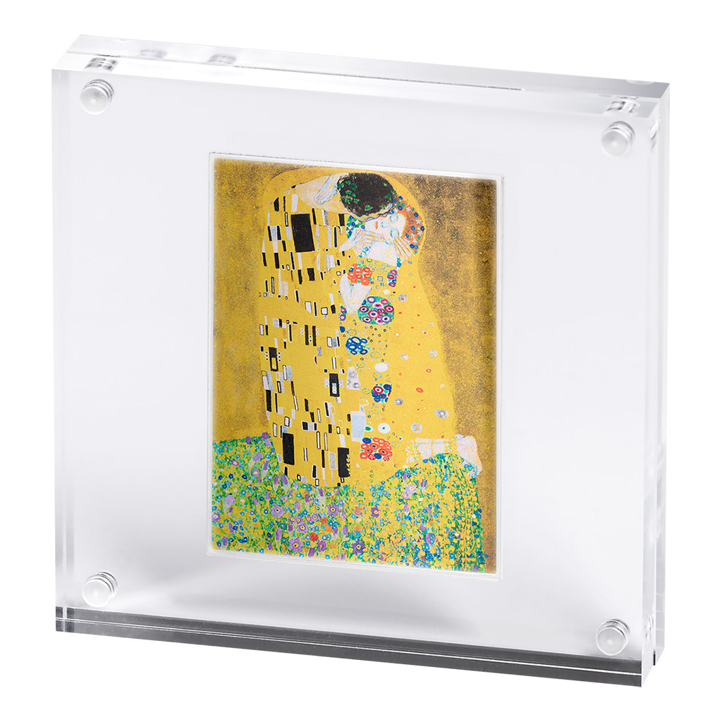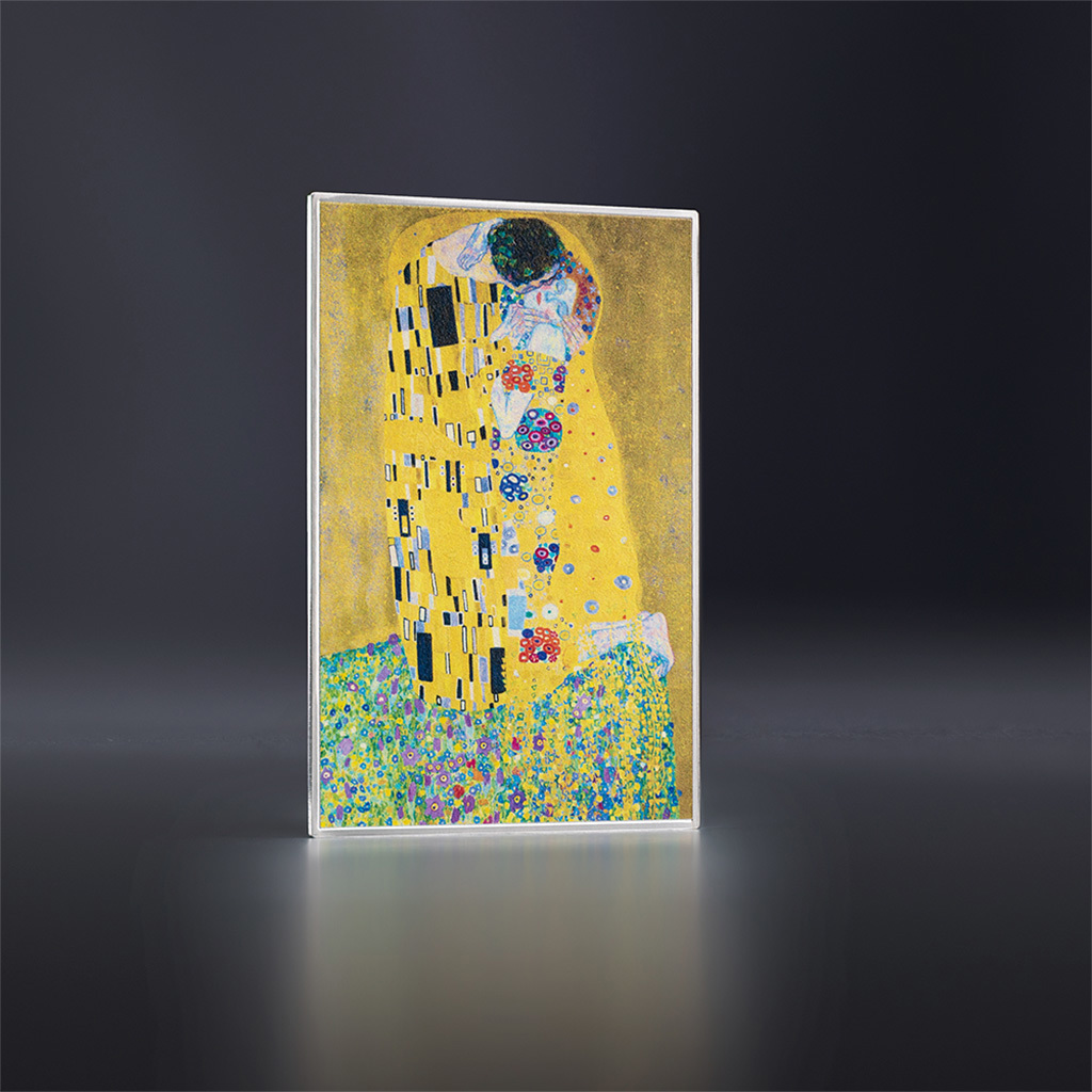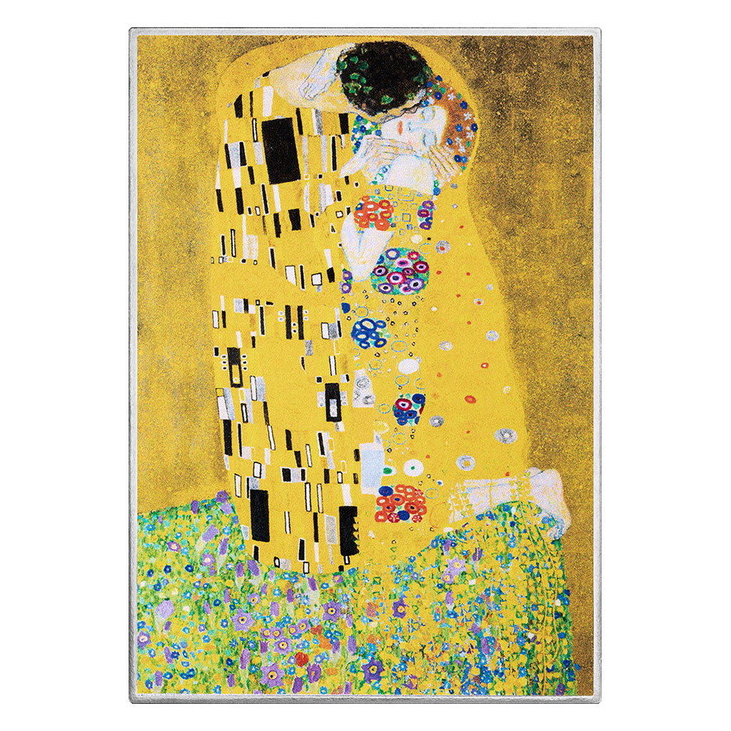 Prostřednictvím stříbrných mincí připomíná mincovna Mint XXI nejslavnější obrazy světového umění. Pochopitelně mezi nimi nesmí chybět Polibek Gustava Klimta.