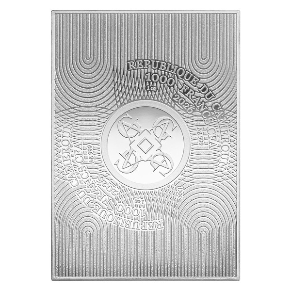 Reverzní strana obdélníkové mince je bezezbytku vyplněna reprodukcí Klimtova díla. Díky technologii kolorování se Polibek vyjímá v živých barvách. Averzní strana, kterou vyplňují dekorativní křivky, pak náleží atributům emitenta – protože mince vychází v licenci státu Kamerun, nese jeho název a nominální hodnotu 1000 FRANCS CFA (XAF).