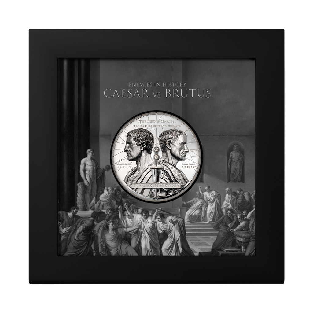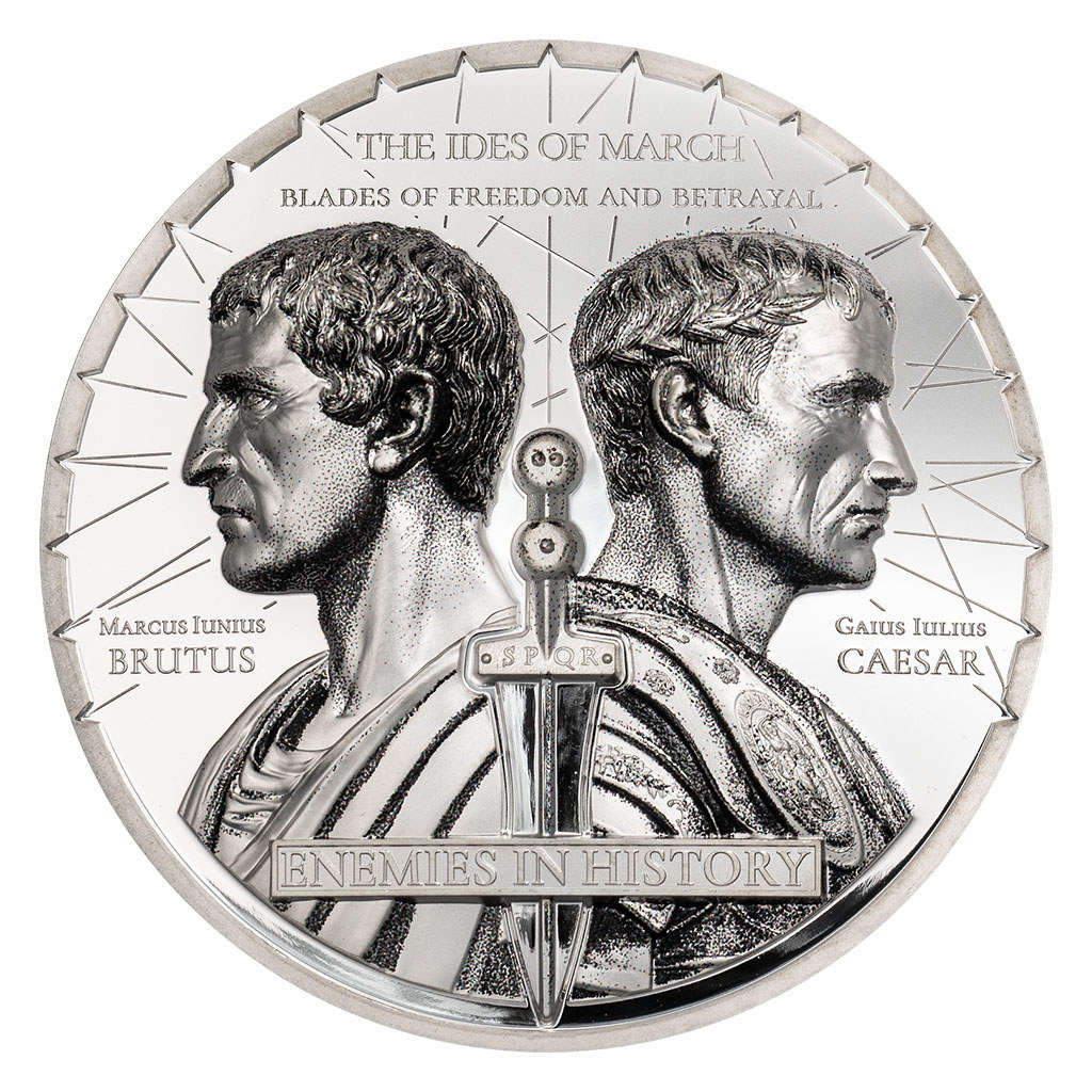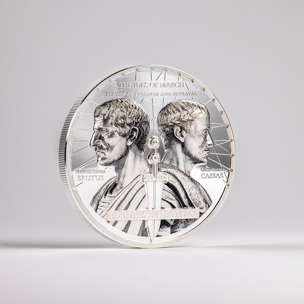 Stříbrná mince společnosti CIT Coin z cyklu věnovaného rivalům historie připomíná osudný svár, který rozdělil Caesara a Bruta.