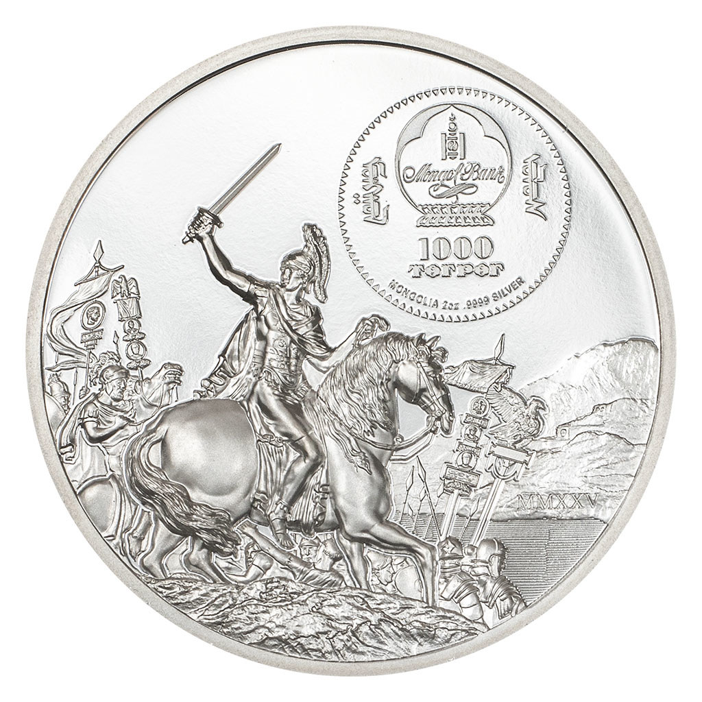 Vysoký reliéf reverzní strany mince předkládá portréty Caesara a Bruta, kteří k sobě stojí zády. Mezi ně je vražena dýka svobody a zrady. Zářezy v rámečku mince představují třiadvacet ran, které diktátorovi zasadili spiklenci. Na averzní straně pak najdete Caesara v plné zbroji, který sedí na koni, a atributy emitenta mince – státní znak Mongolska a nominální hodnotu 1000 TOGROG.