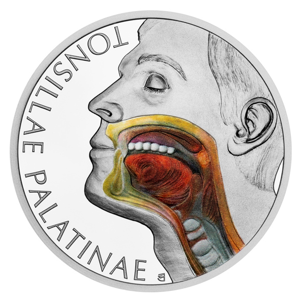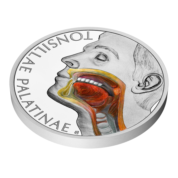 Sedmá stříbrná mince České mincovny z cyklu s názvem Lidské tělo je věnována lymfatické soustavě – konkrétně krčním mandlím.