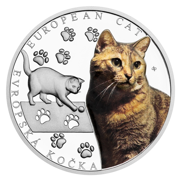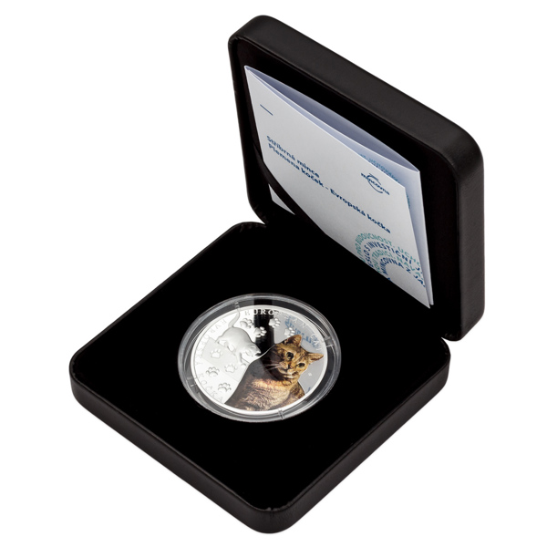 Na desáté stříbrné minci České mincovny z cyklu Plemena koček se objevuje evropská krátkosrstá kočka.